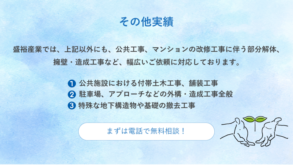 • 特定施設の解体:事業活動に伴う特定有害物質や設備の除去についても、専門的な知識をもって対応いたします。